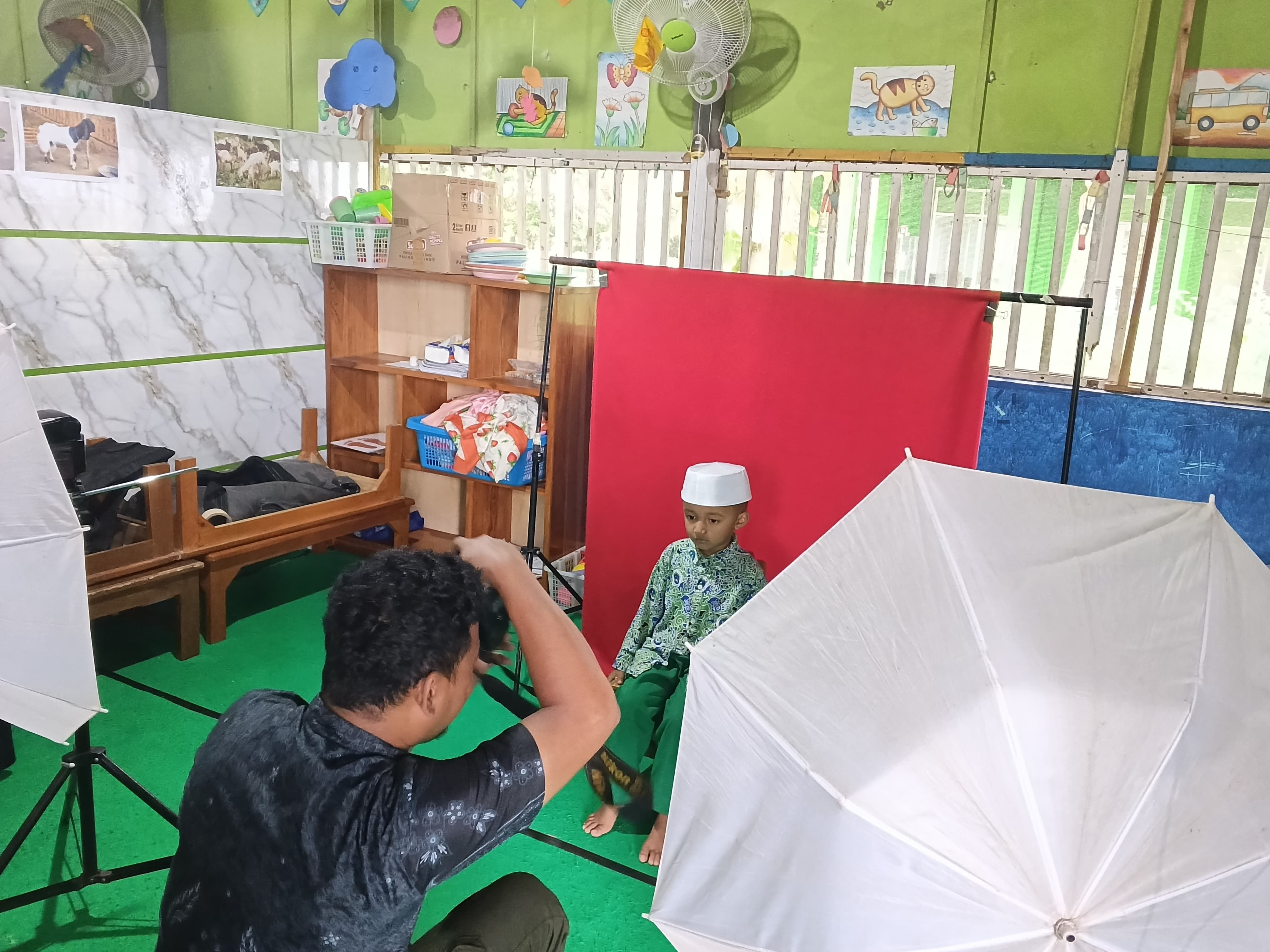 Akbar dan Yudhi membantu proses pemotretan di TK Al Fikri Manca, termasuk menyetting tempat foto dan membantu mengatur anak-anak TK agar proses foto berjalan tertib.
