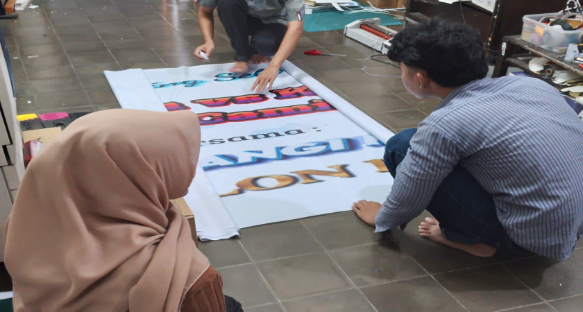 Kegiatan dimulai dengan memotong banner hasil cetak agar sesuai dengan ukuran yang telah ditentukan dan tampak rapi.