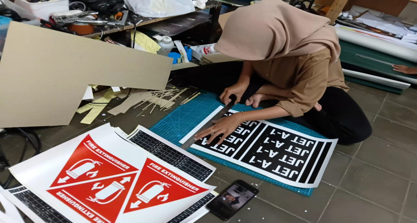 Minggu, 11 Januari 2026. Hari ini di tempat PKL lagi fokus banget ngerjain bagian potong-memotong banner. Sebelum mulai, saya siapin dulu 'senjatanya'—ada penggaris panjang, cutt