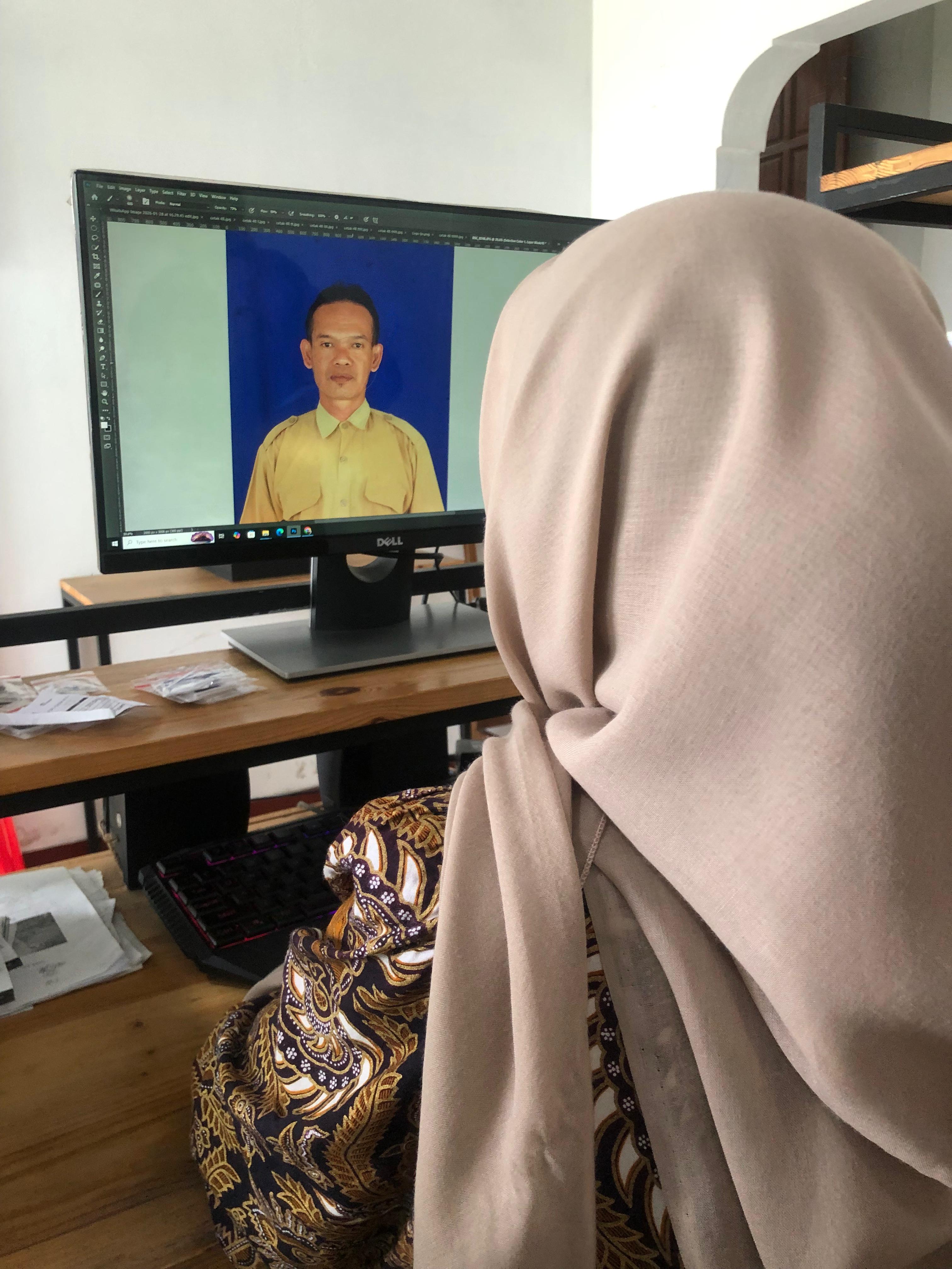shift pagi disuruh edit pasfoto nikah kemarin jumat, saya pilih yg senyumnya pas, kemudian sekalian saya tata dikertas 5R seperti biasa dan langsung saya kirim ke gmail dtg ibu' mau p