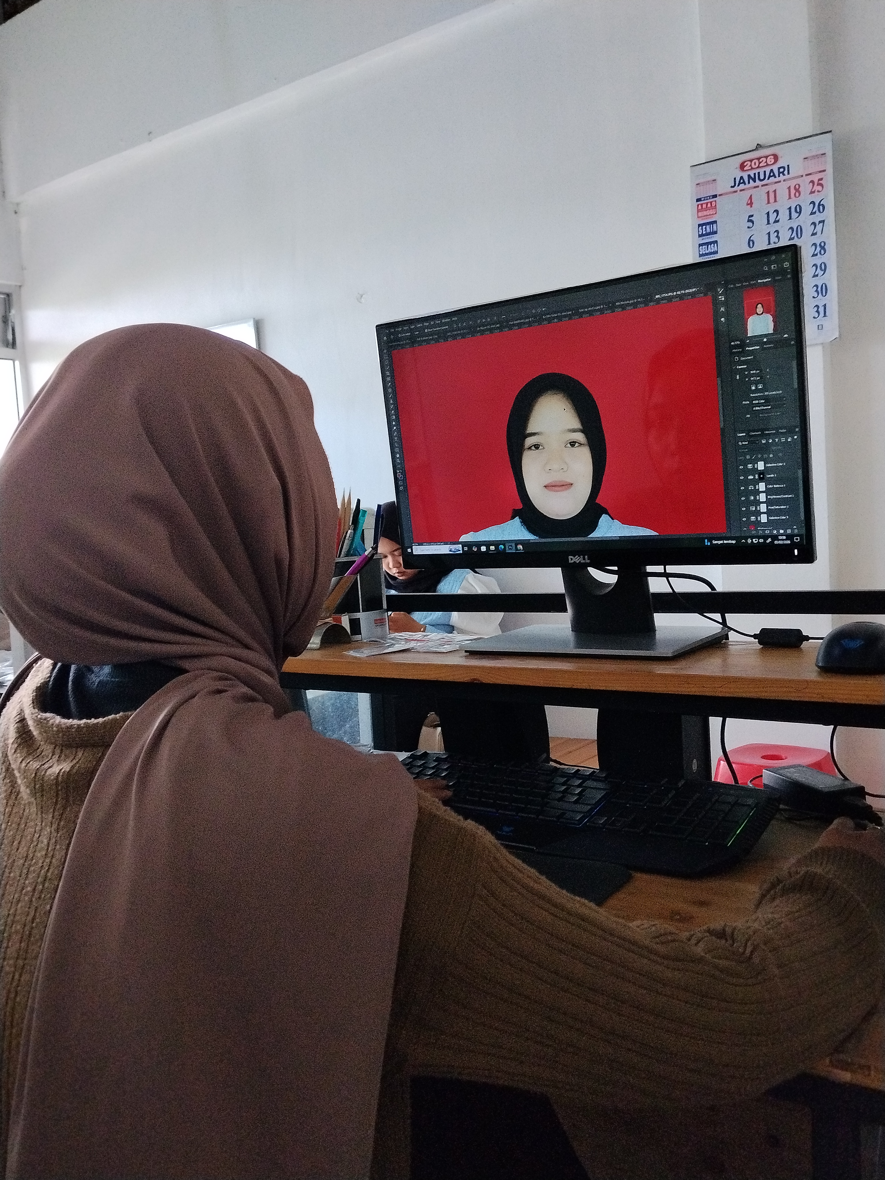 shift pagi, menyalakan pc kemudian melayani customer mencatat keperluan pasfoto nikah, saya siapkan kamera dan mempersilahkan siap', mas dimas yg memfoto, saya merapikan jilbab mbaknya,