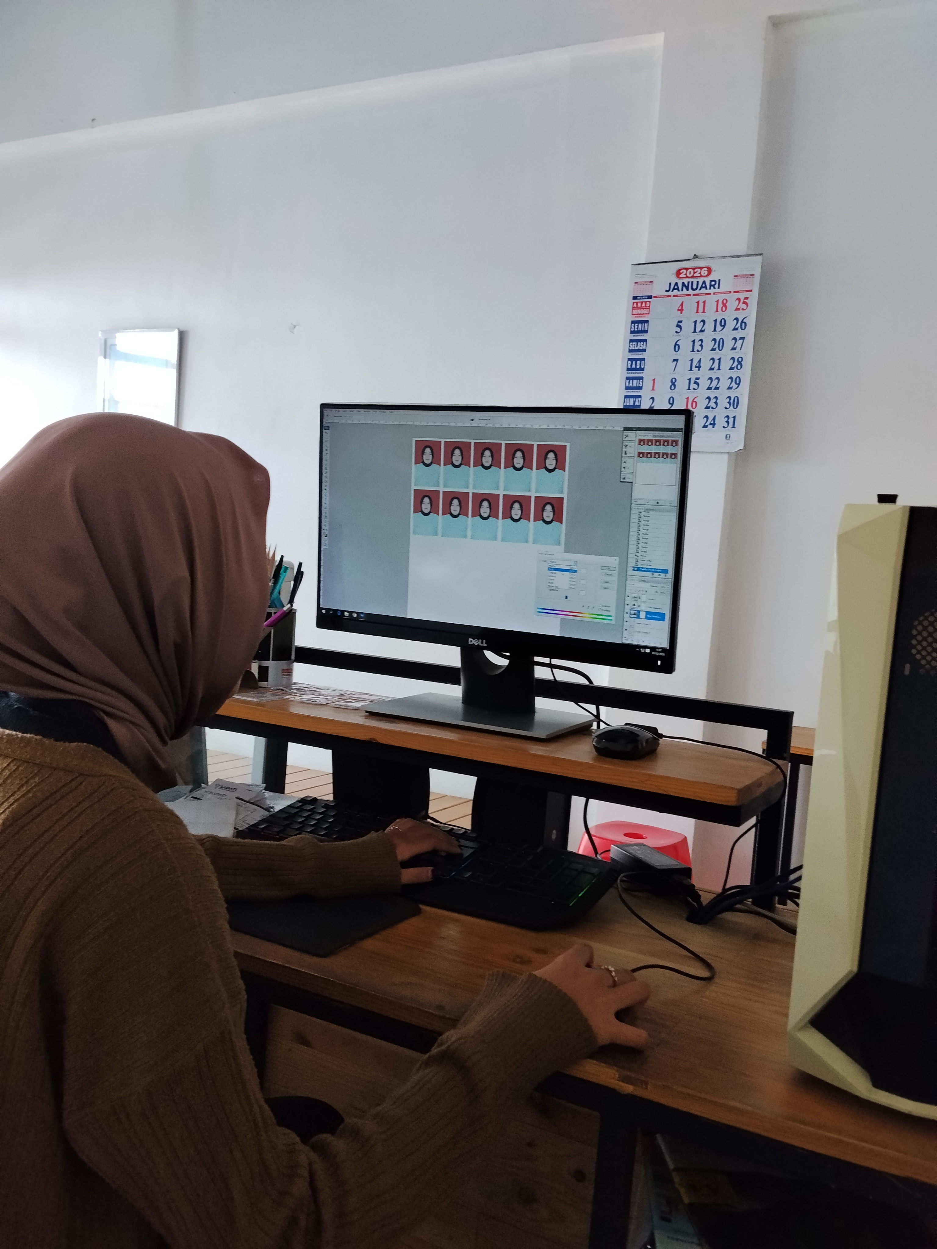 shift siang melakukan finishing pasfoto untuk ijasah, kemudian menatanya di kertas 4R sore hari ada klien ingin pasfoto tawkwondo untuk ujian, saya segera mencatat menyiapkan kamera m