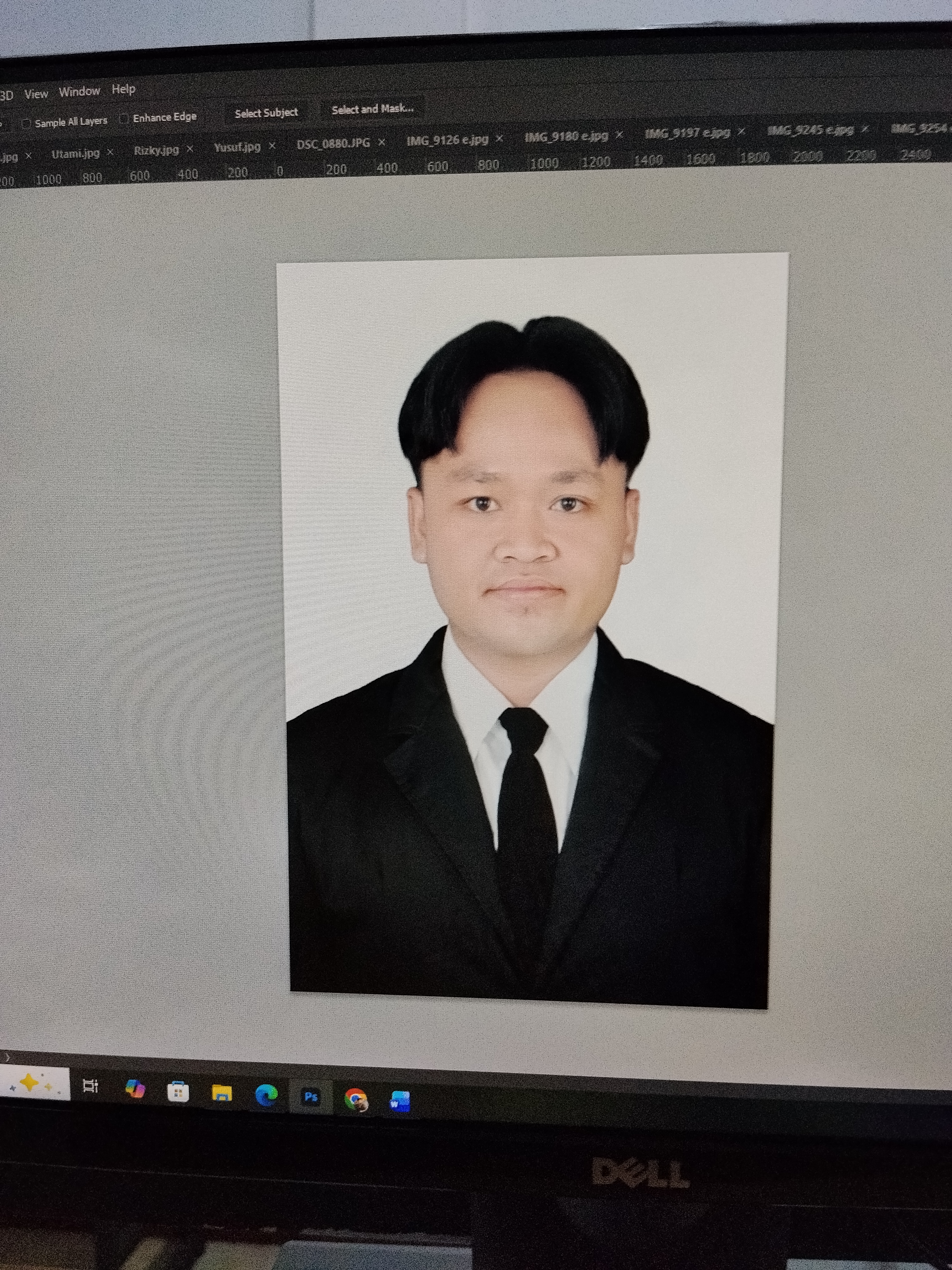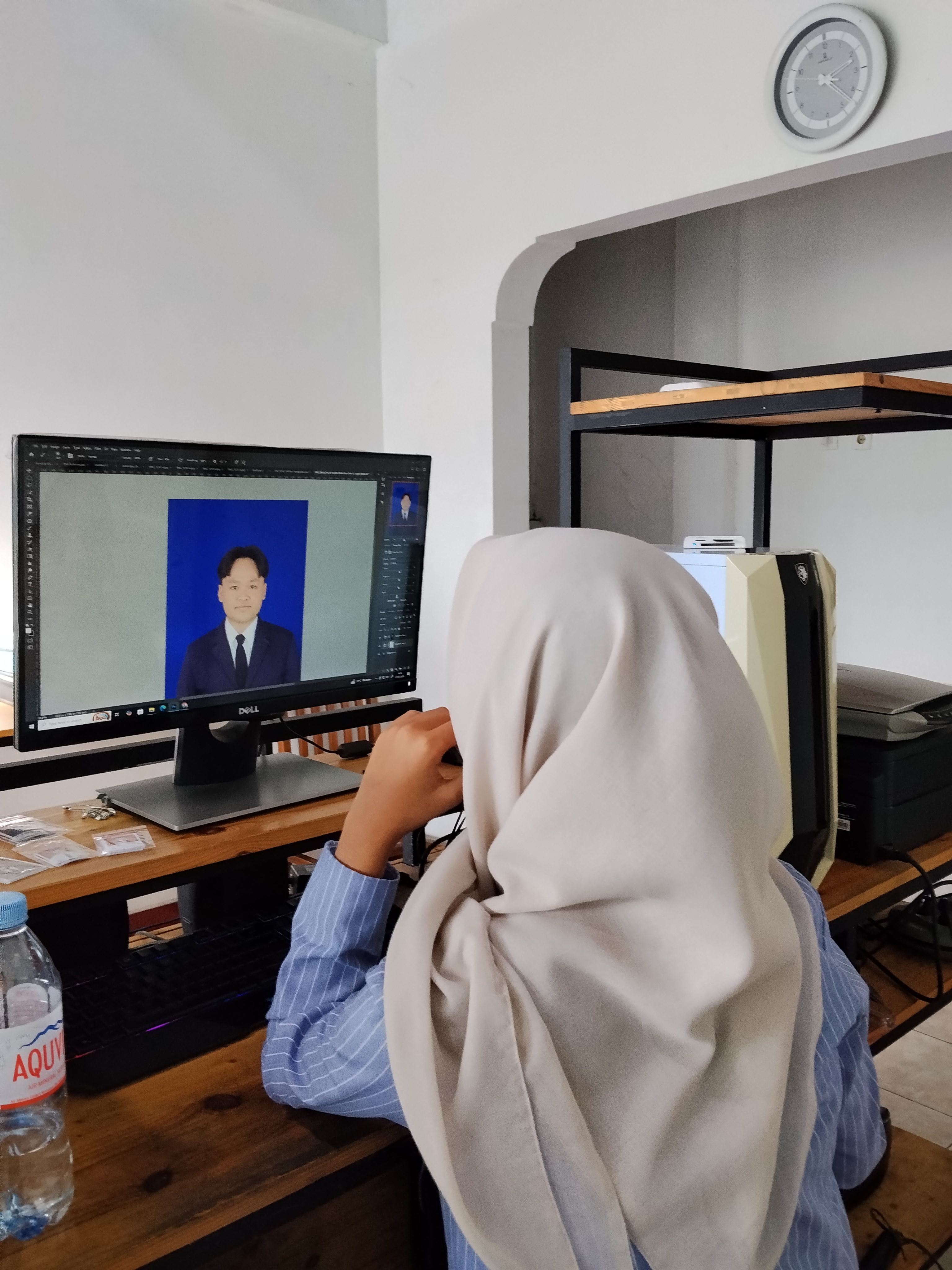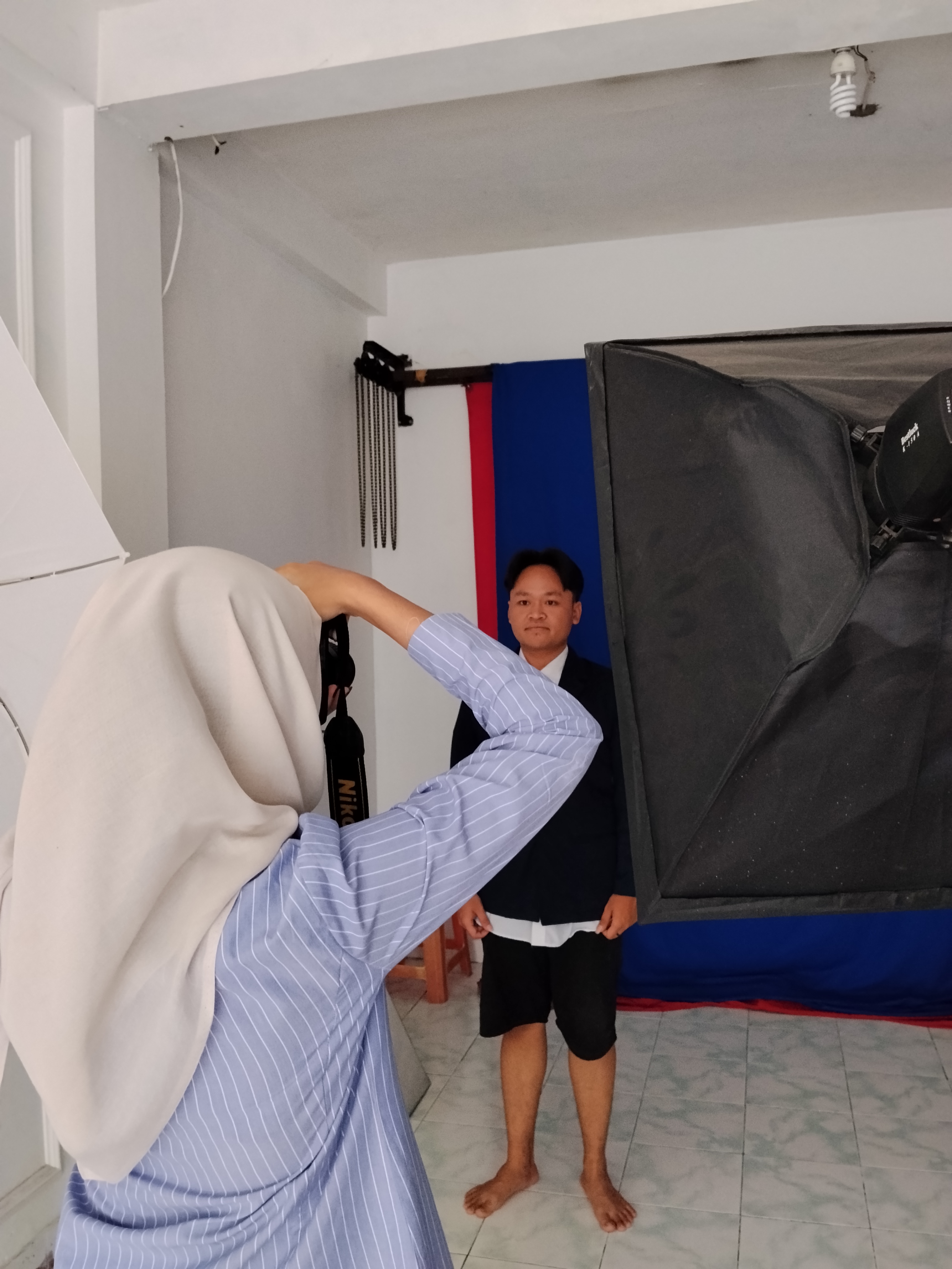 kemudian selesai istirahat sholat makan ada customer ingin pasfoto bg putih untuk syarat kerja, saya segera menyiapkan kamera flash lensa lampu memberi tutorial memakai dasi dan mengarahkan agar dasi dan Kepala nya pas, saat sudah menemukan foto yg pas saya segera mematikan lampu dan mengeditnya, ini adalah kali pertama saya mengedit bg putih yg dimana harus disesuaikan antara wajah dan bg, saat sudah pas saya segera mencetak dan memotongnya bersama yuli