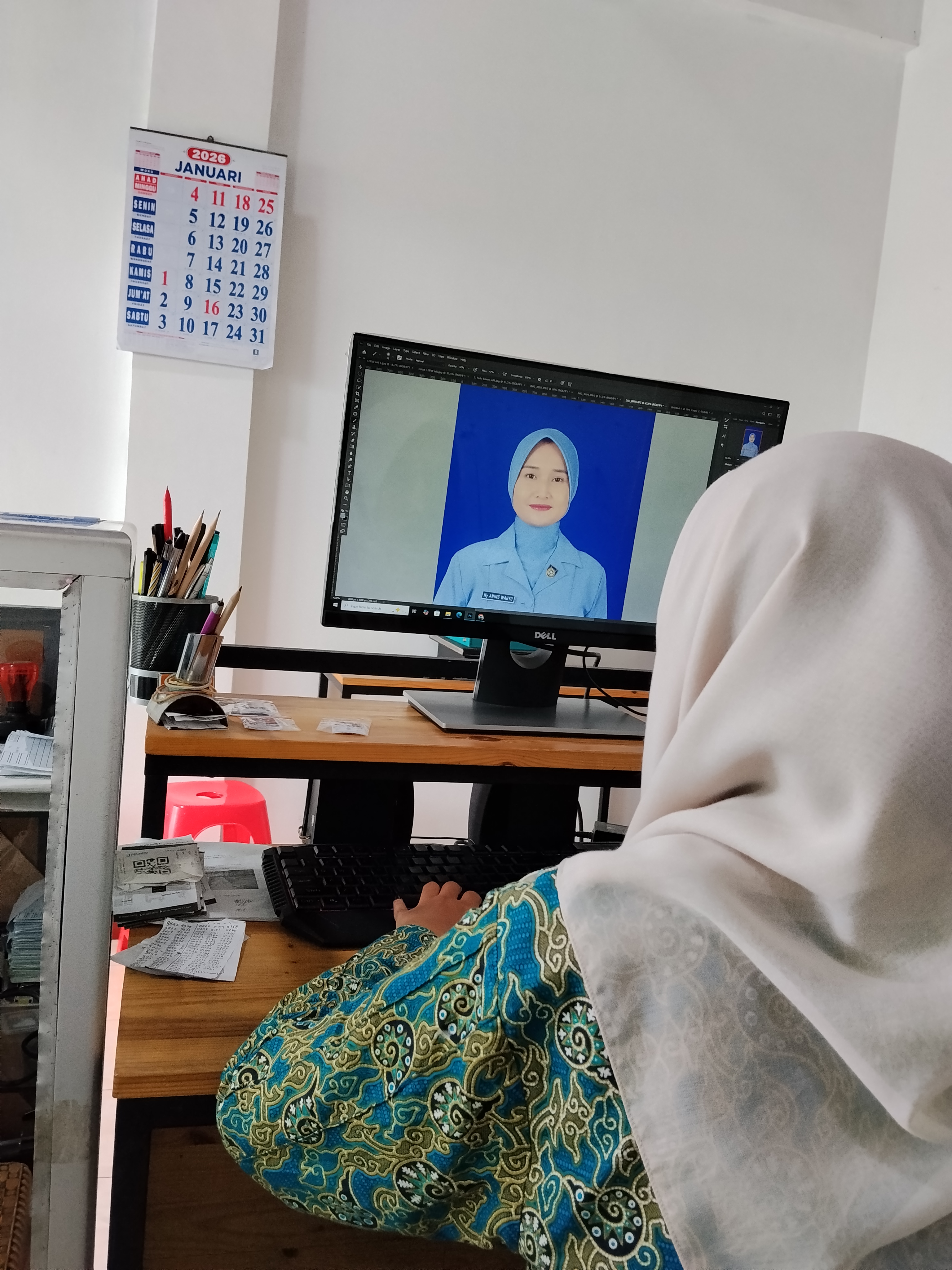 shift pagi, menyalakan pc kemudian melayani customer mencatat keperluan pasfoto nikah, saya siapkan kamera dan mempersilahkan siap', mas dimas yg memfoto, saya merapikan jilbab mbaknya,
