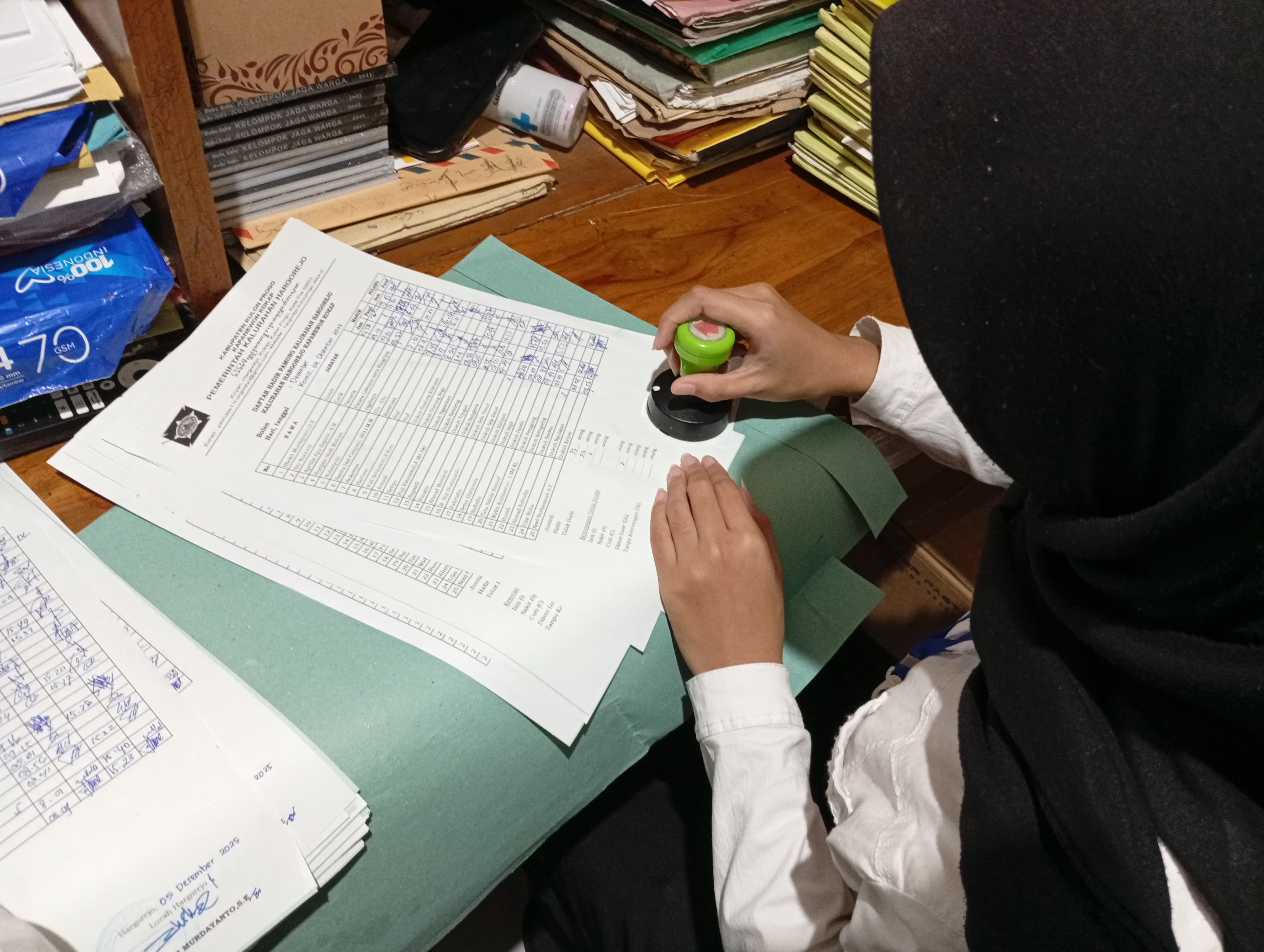 Memberi stampel pada daftar absensi pegawai dan jurnal