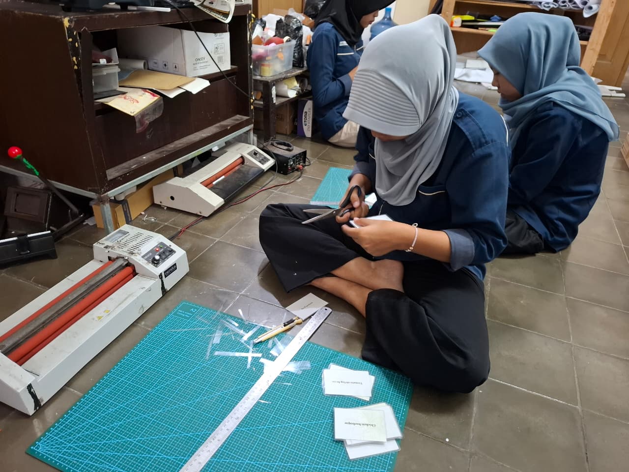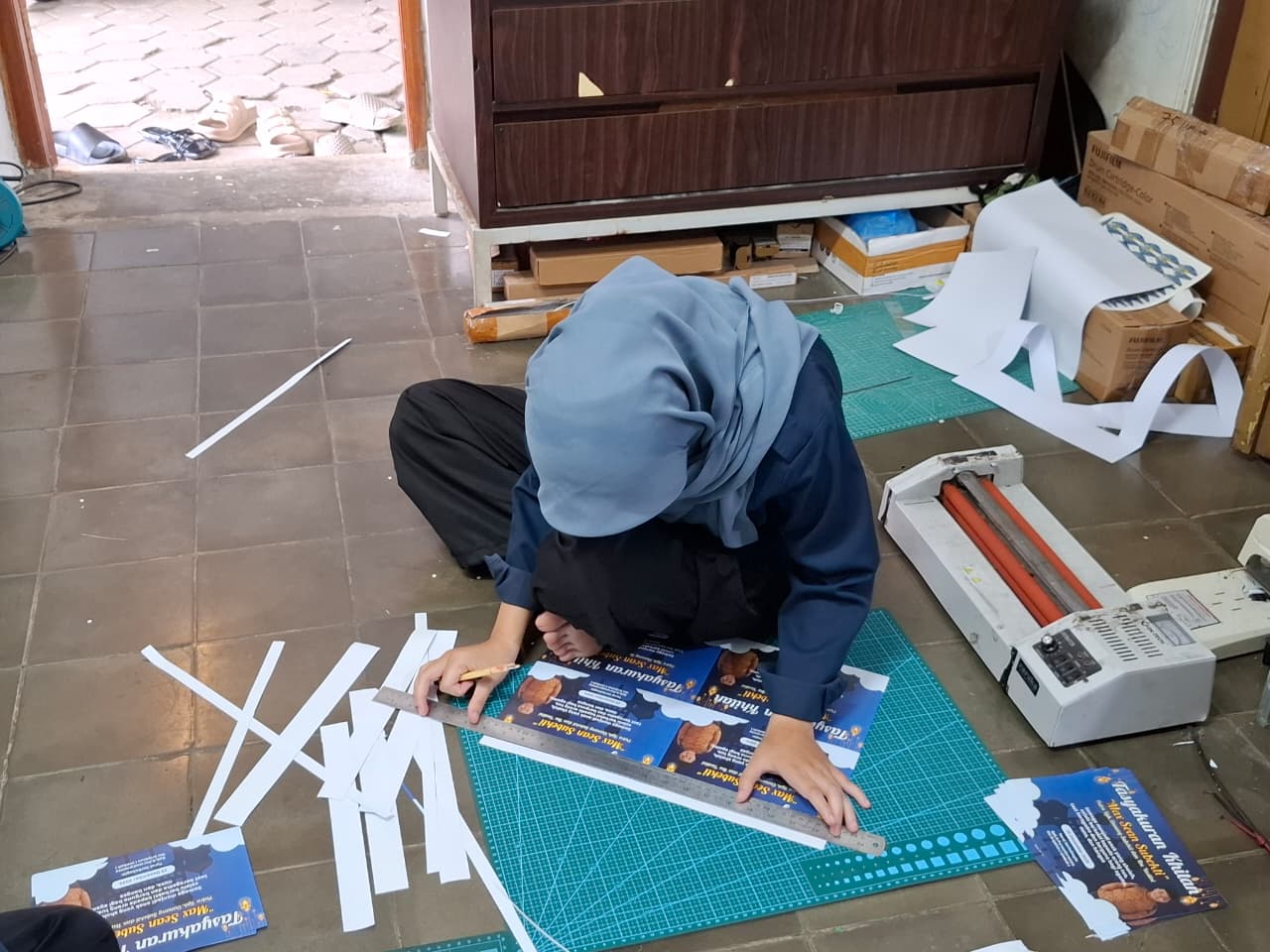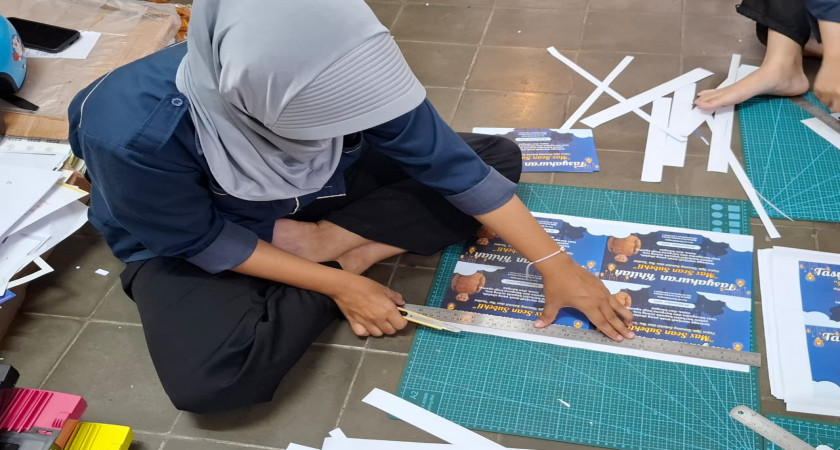 Kegiatan diawali dengan memotong kertas tasyukuran sesuai ukuran yang telah ditentukan. Proses pemotongan dilakukan dengan teliti agar hasil potongan rapi dan seragam.