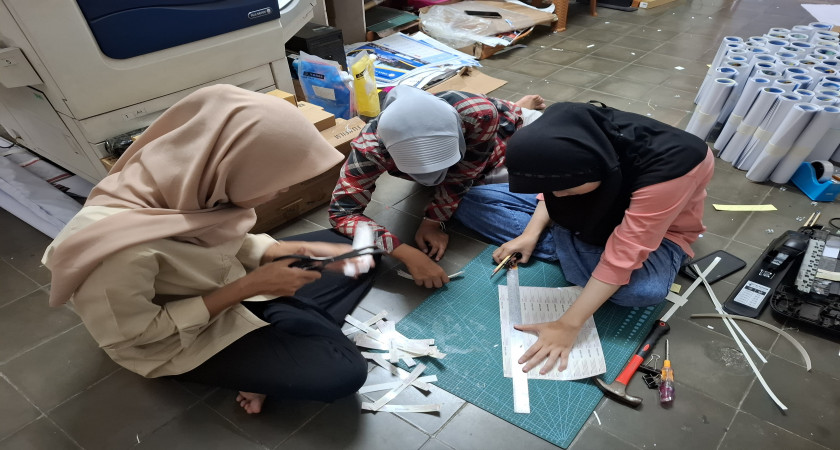 Kegiatan diawali dengan memotong kertas tasyukuran sesuai ukuran yang telah ditentukan. Proses pemotongan dilakukan dengan teliti agar hasil potongan rapi dan seragam. Setelah itu, keg