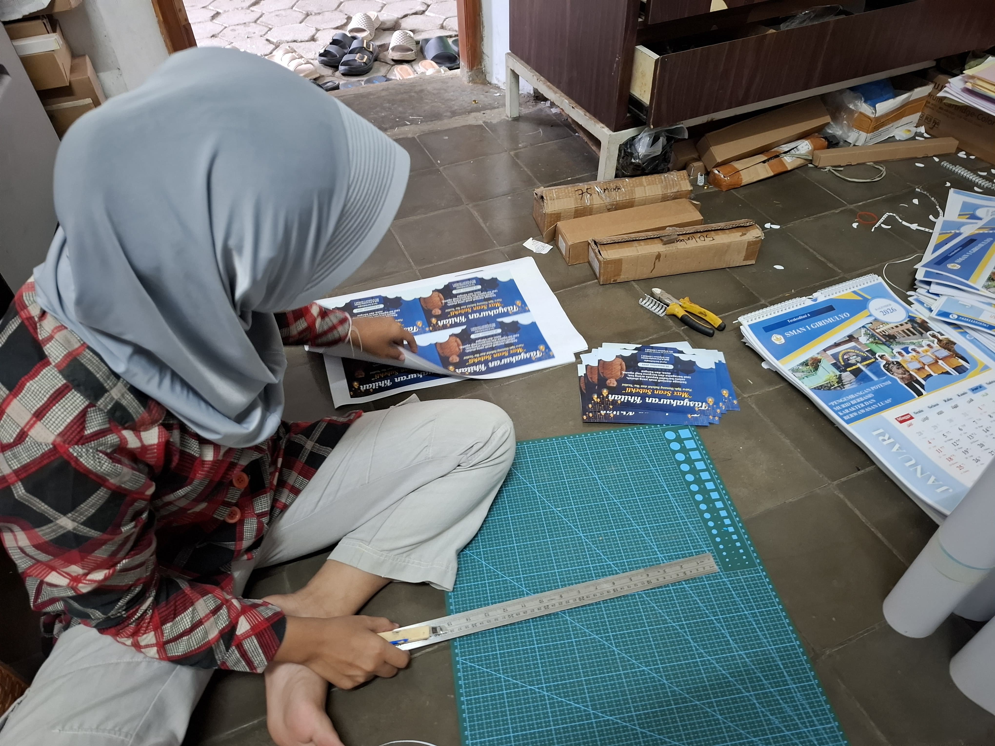 Pada hari Minggu, 28 Desember, saya melaksanakan kegiatan Praktik Kerja Lapangan (PKL) di tempat percetakan. Kegiatan diawali dengan memotong kertas tasyukuran khitanan sesuai ukuran yang telah ditentukan. Proses pemotongan dilakukan dengan teliti agar hasil potongan rapi dan seragam.