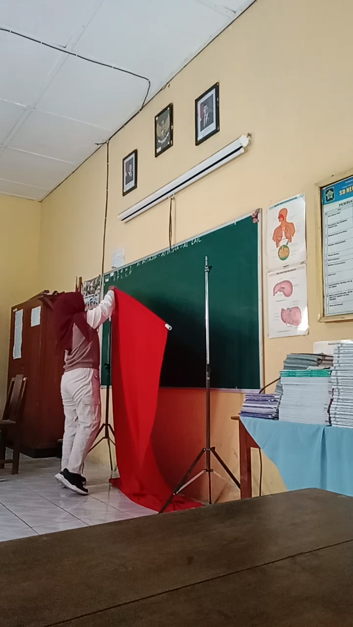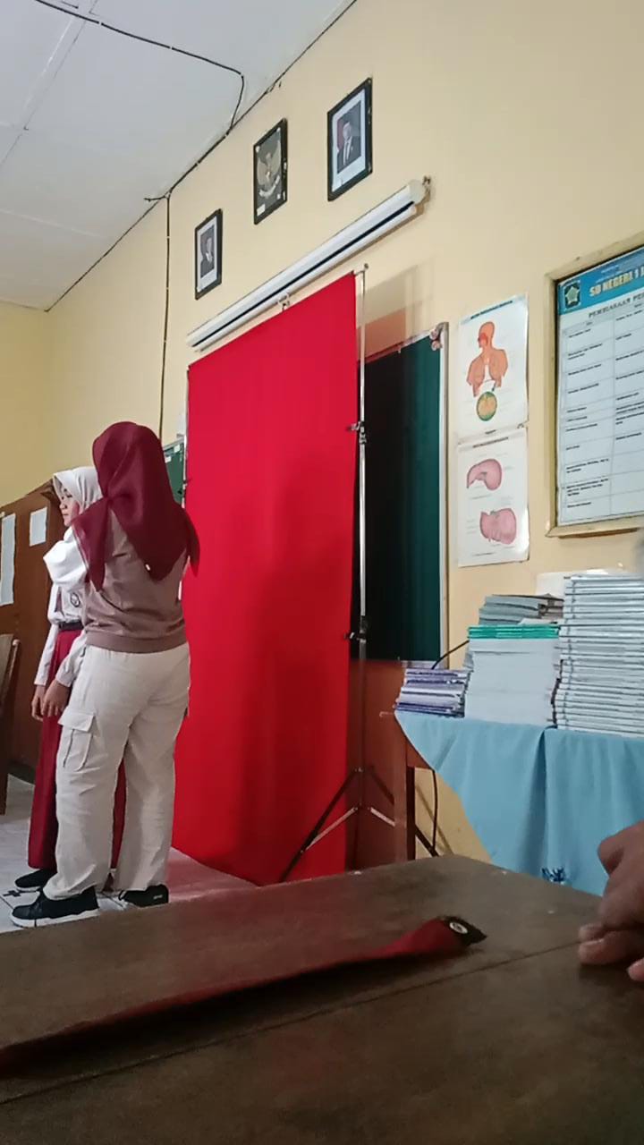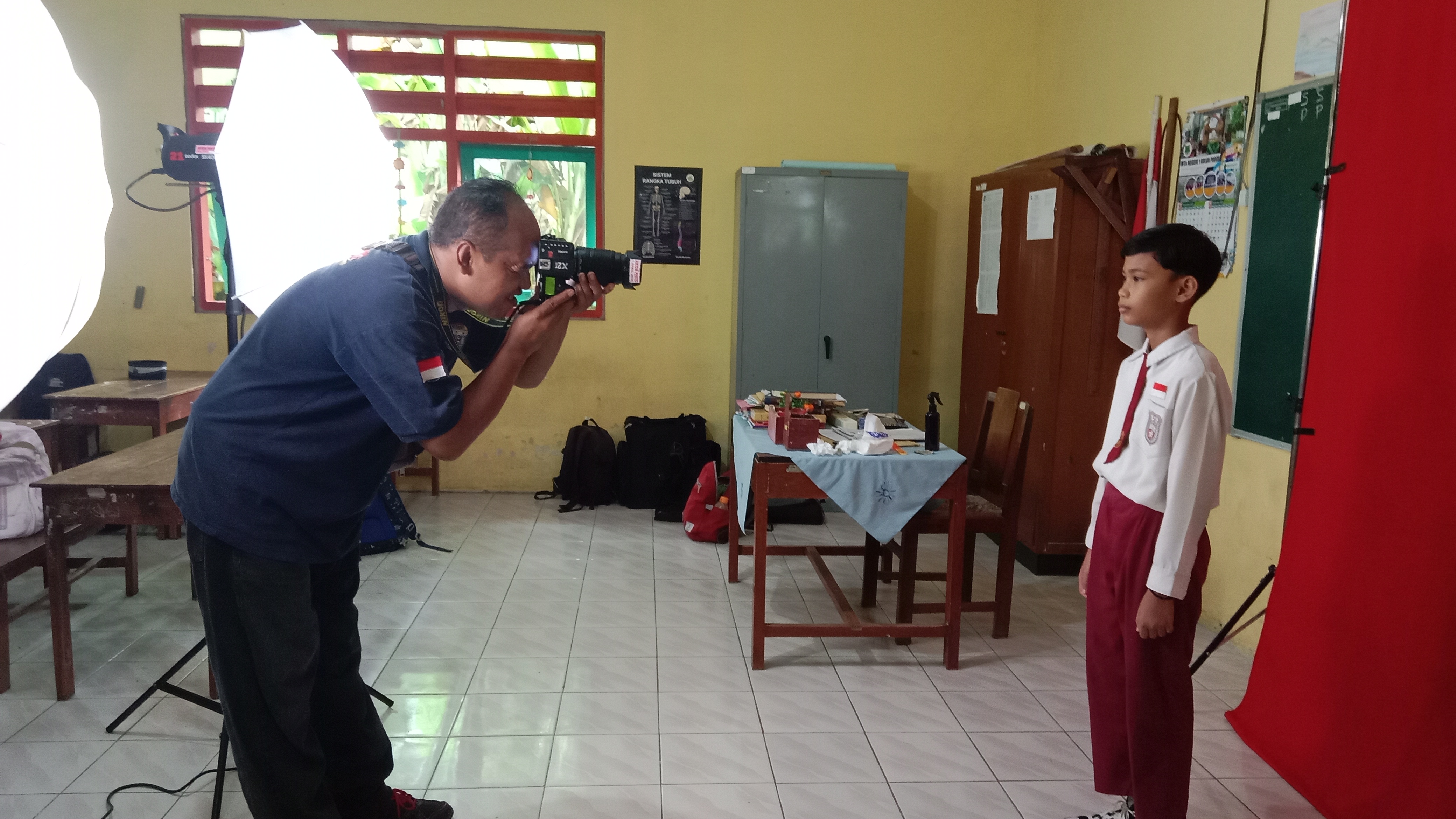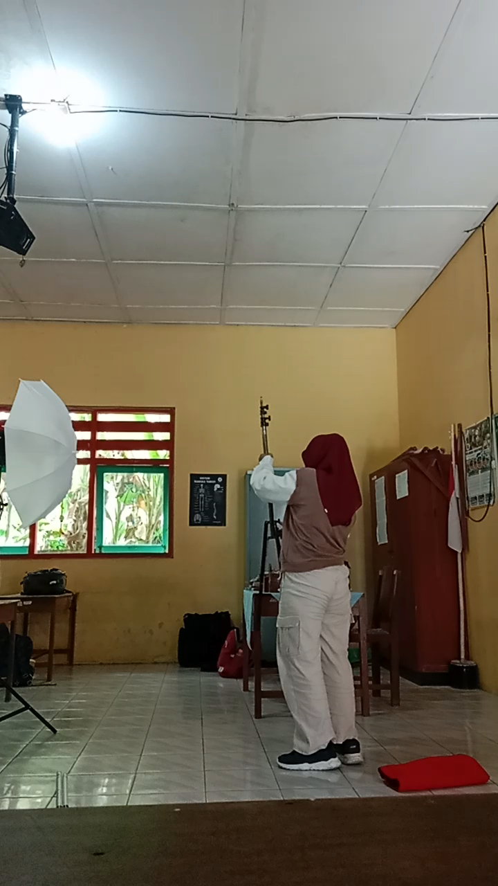 Saya membantu menyiapkan alat-alat seperti memasang tripod, memasang payung lighting, dan membantu memindahkan tas perlengkapan. Setelah semua siap, proses pemotretan dimulai. Pak Agus sebagai fotografer utama mengambil gambar, sementara Saya bertugas memanggil nama siswa satu per satu, merapikan tampilan mereka seperti kerah baju, saku, dasi, dan menempelkan badge sekolah. Selain itu, saya juga mengisi lembar DSC sebagai data pendukung.